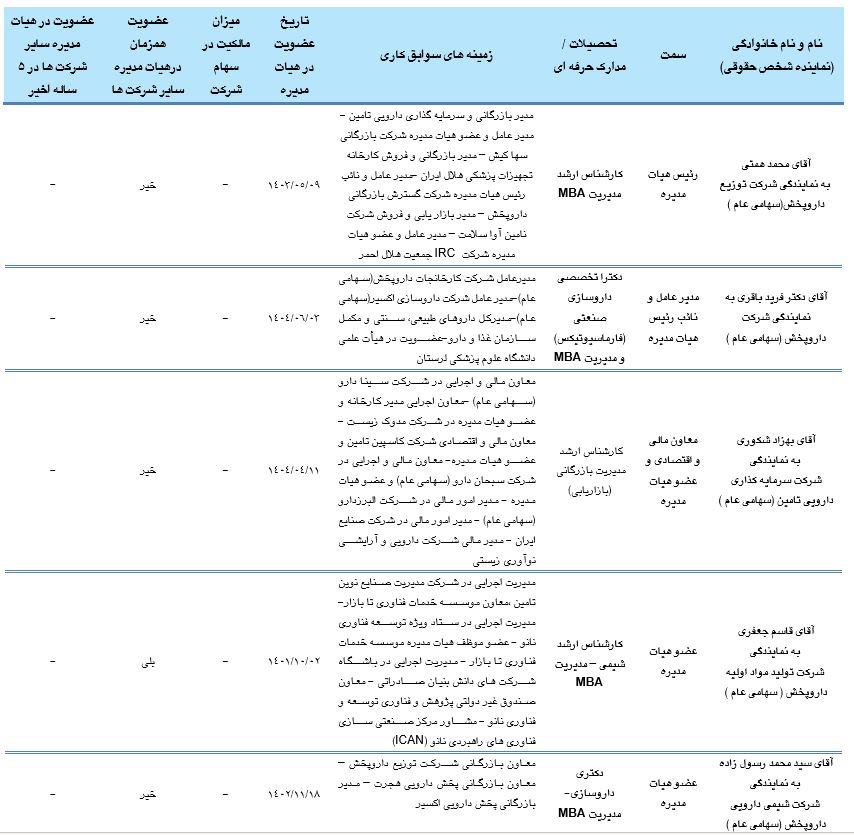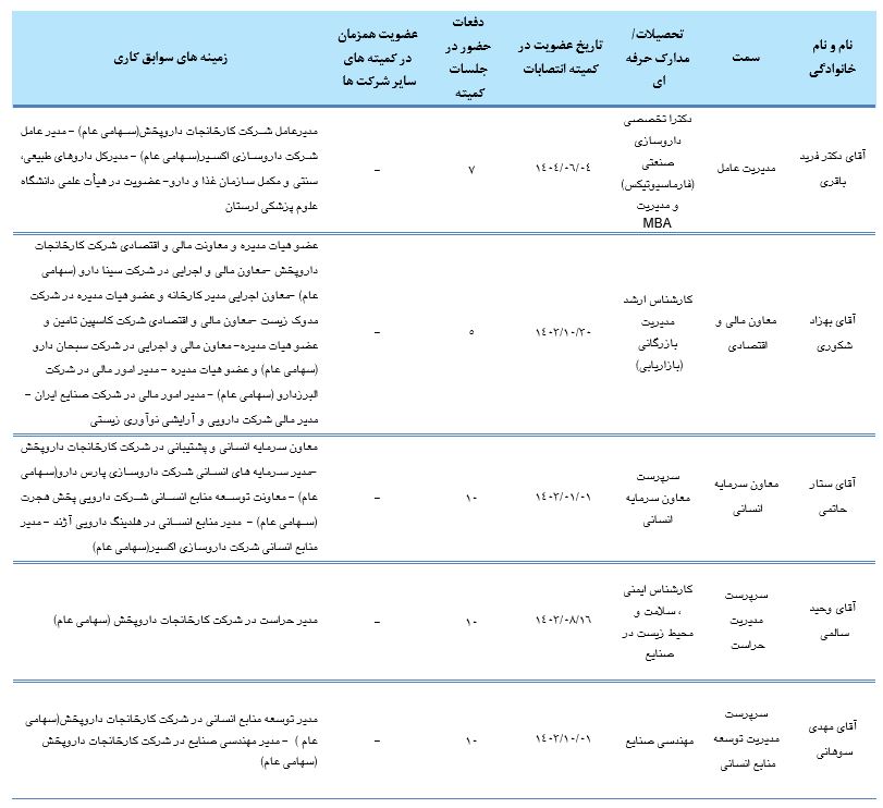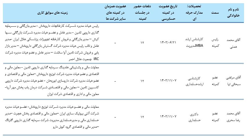 کمیته حسابرسی شرکت کارخانجات داروپخش از تاریخ 16/10/1391 تشکیل و با معرفی اعضا و سمت آنها و همچنین معرفی مدیر حسابرسی داخلی فعـالیت خود را آغاز نموده است و در حال حاضر با دو عضو به شرح جدول ذیل به فعالیت خود ادامـه می دهد.