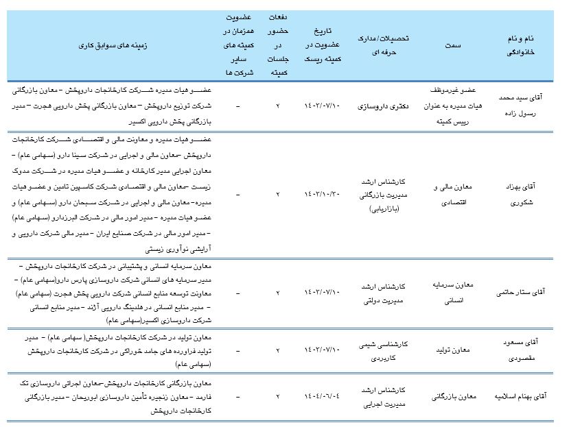 کمیته مدیریت ریسک در راستای اجرای اصول حاکمیت شرکتی جهت کمک همه جانبه به مدیریت برای دستیابی به اهداف هماهنگ با برنامه استراتژیک شرکت از سال 1399 فعالیت خود را آغاز نموده و در حال حاضر با اعضا طبق جدول ذیل به فعالیت خود ادامه می دهد.